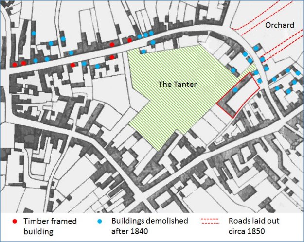 The 1971 Town Plan envisaged a Market Hill bypass running down the Naverne valley to a car park on the site of the Country Primary School, which was to be moved to Melton. The threat of these changes, and a proposal to widen New Street, blighted the line of 18th century cottages adjacent to northern edge of The Tanter and many fell into a semi-derelict condition. When the road widening proposal was dropped in 1975 the District Council decided to restore the cottages. The only building to be demolished was a house, which at one time been a sweet shop, at end of the terrace. The vacated site was used for a private parking area and a small courtyard.