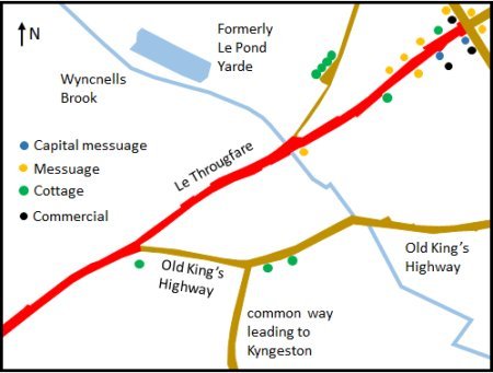 The coloured dots on the map above indicate the approximate location of the dwellings and commercial buildings listed in the Extent. Just below where Wynchells Brook goes under Le Thoroughfare there was messuage now one brewery. There was still a brewery on this site until the late 19th century. Prior to the Reformation there was also a cross at the eastern end of what is now Cumberland Street.