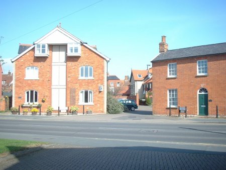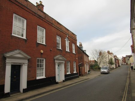 The line of single storey shops abutted a rather ugly, red brick building, which survived the fire. This building is currently a hairdressers and there is residential accommodation above. Next to it, in stark contrast, is Marston House, a splendid Georgian red-brick building. This imposing town house has fine plain tile roof with hipped dormers. On the second floor there are Victorian large pane sashes and a pleasing central first floor windows with lozenge patterned glazing bars. On the ground floor the windows have external shutters. The entrance has a notable timber door-case with a Corinthian entablature and fluted Doric pilasters. It is the most elegant door in the town.