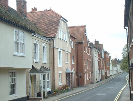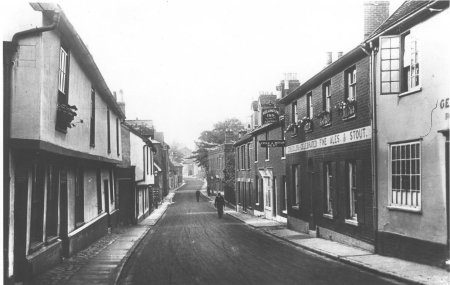 In 1824 the local artist James Rowe produced the painting on the right. It is a view of Cumberland Street from Cross Corner. It shows part of a butcher's shop at the bottom of Church Street. The 1560 Extent mentions a shop in exactly the same position. Sadly Rowe did not paint any more streetscapes of Woodbridge.