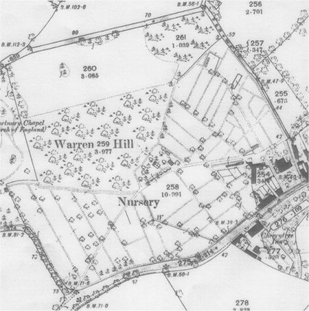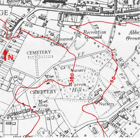 Map of the Warren Hill area in 1950. The red lines are the 50ft and 100 ft contours.