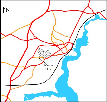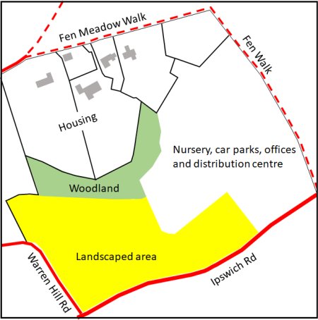 The 1967 Town Plan defines Warren Hill as the area enclosed by Ipswich Rd., Warren Hill Rd., Portland Crescent, Fen Meadow Walk and Fen Walk. It includes the cluster of ten houses between Warren Hill and Portland Crescent along with the oldest of the two cemeteries and Notcutts Nursery.