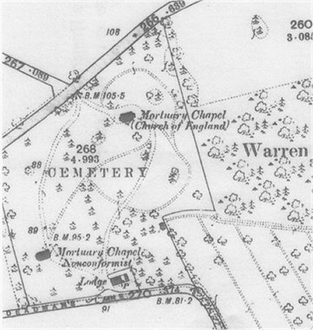 William Pattison was commissioned to design the lodge and twin mortuary chapels. (Church of England and Non Conformist.) He was also asked to complete the burial ground by 'erecting the necessary buildings thereon and enclosing the same with an iron palisade along Dedman's Lane'. (Now Warren Hill Road.)