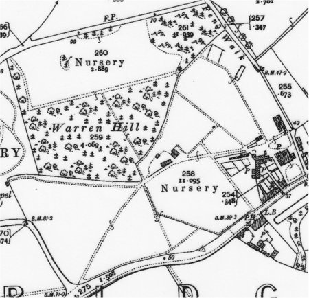 The extract from the 1840 tithe map on the right records the first significant change to the Warren Hill area. Plot 189 (outlined in green) was purchased by John Wood Jnr in 1784 and it became a nursery ground.