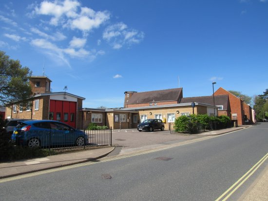 This photograph show the Fire Station and the Police Station. The redbrick buildings in the background of the photograph are the Woodbridge Red Cross Centre and Mussidan Place, a complex of retirement homes. They were both completed in 1973.