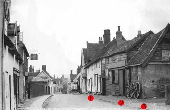 Number 1 is a terrace of three houses. Number 2 is Edgar Goldsmith's "smith and farrier". Number 3 is a wide entrance to a row of cottages which was a right angles to Theatre Street. Beyond this entrance there was a short terrace of cottages.