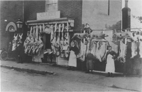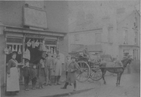 The same shop as in the previous picture but now owned by Clarke. From 1924 to 1953 the butchers shop was owned by Norman Billby. The shop was demolished in the 1970s to make the entrance to Winifred Fision House. |