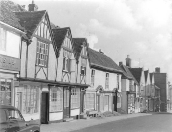 The Angel Inn, the timber framed building on the left of this photograph, abuts Angel Lane. The buildings to the right of Angel Lane are on Market Hill.