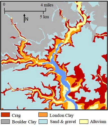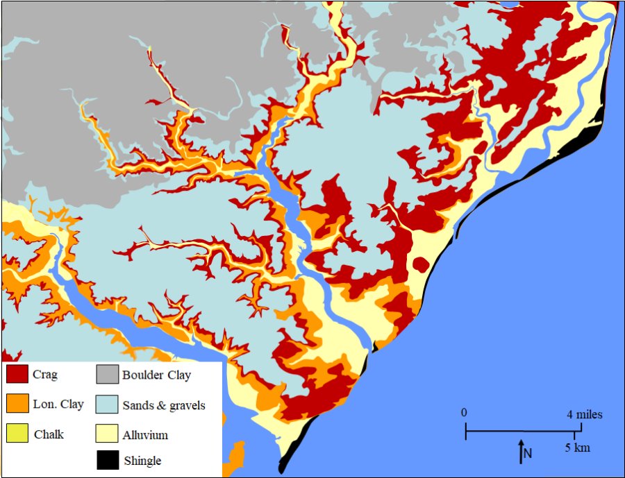 The map on the right shows how the rivers and streams have cut into the Bolder Clay and the upper layer of Crag. Below the Crag rivers and streams have cut into the under-layers of London Clay and Alluvium.