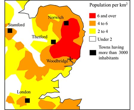 This map shows how the population density varied across East Anglia. Woodbridge was at the edge of the most densely populated rural area within these counties. Woodbridge was, however, insignificant compared with Walton and Goseford which were at the entrance to the Deben estuary.