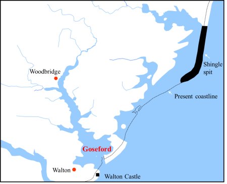 The location of Goseford is shown by this map. Goseford was just an area of the Deben estuary where there were a number of landing areas and secure anchorages. It was a thriving maritime centre by the time of the Norman Conquest and there was a market at nearby Walton.