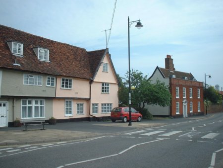 On the left of this photograph there is a timber frame house which is still in its original form. On the right there is a timber framed house which has had a brick facade added.