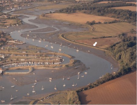 Part of the river wall on the far side of the estuary is marked by a white arrow on the aerial photograph to the right. The photograph shows the stretch of the Deben from the quays by the Tide Mill to the bridge at Melton. The river wall enabled the low lying land to the right to reclaimed. The mud and saltings to the left of the wall are covered at high tide.