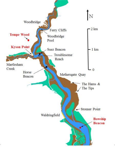 The Woodbridge pilots kept watch from Tempe Common which was at the top of a ridge running down to Kyson Point. From there they could look down river. When a ship was sighted, a pilot would walk along a path skirting Tempe Wood to his lug-sail boat moored at Kyson point. From there he would sail down river to the Bowship Beacon.