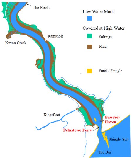 The extent of the Deben Estuary at low and high tide and the locations of the main beacons marking the deepest channel.