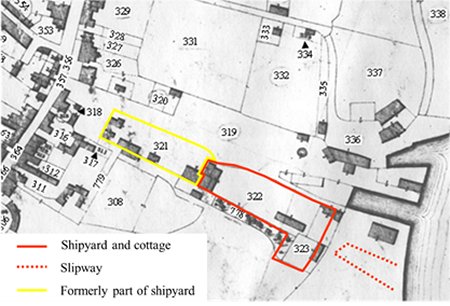 In November 1830 William Taylor took over the shipyard and eight years later it is clearly shown in on a 1838 map. An annotated extract from this map is shown here. The area outlined in red was being used as the shipyard and the area outlined in yellow, which was at one time part of the shipyard, was being used by a timber importer. The red dotted line marks an indent, shown on an earlier map, which was probably a slipway.