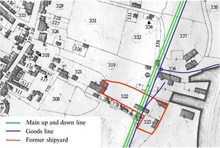 In 1850 the shipyard was advertised to let but there were no takers. When the East Suffolk Railway started to plan their service to Woodbridge in 1853 the shipyard was still vacant. They bought it in 1856 and four years later they had laid the main up and down lines and a goods line through the old shipyard. The impact of the railway is clearly shown here by overlaying the railway lines on an extract from the 1838 tithe map.