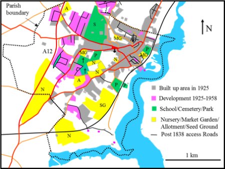 The other changes of note are that, by 1958, Notcutt’s Nursery had been expanded and several allotments had been created. Suffolk Seed Store Ltd. had also become established in the town and had created a large seed ground by the railway. Woodbridge Urban District Council had been given land to establish Elmhurst Park and to significantly enlarge a park by the riverside.