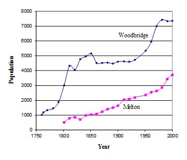 The amount of land in Woodbridge which was suitable for house building was constrained by the A12 and the estuary. When this land was used up, house building started in the adjoining parish of Melton and its population began to rise as shown by the graph below.