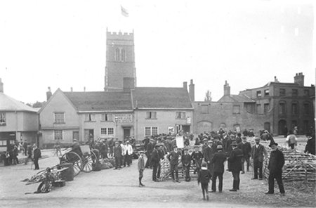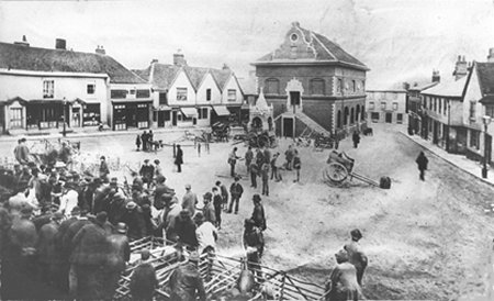 Woodbridge Market circa 1880. All the stalls and pens were in the upper part of what is now Market Hill.