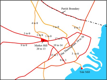 Market Hill, the historic centre of the town. The change in the distribution
