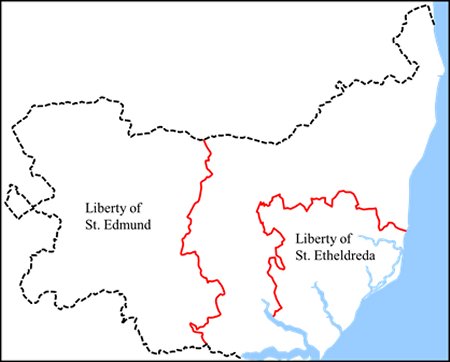 The extent of the Liberty of St Edmund and the Liberty of St Etheldreda. The latter encompassed the hundreds of Loes, Thredling, Plomesgate, Carlford, Wilford and Colneis.