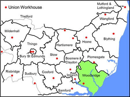 The Poor Law Unions covering Suffolk and the locations of the workhouses. The Woodbridge Poor Law Union is shaded green. Its workhouse was at Nacton. |