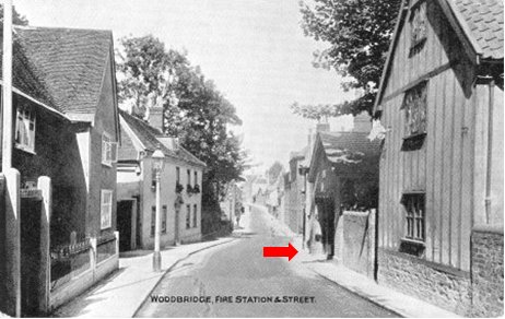 Looking down Cumberland Street in the opposite direction. The red arrow marks the Fire Engine Station.