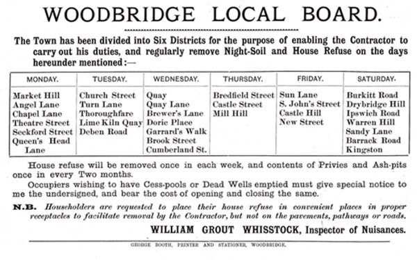The undated notice below shows how the Woodbridge Local Board organized the collection of night soil and house refuse (predominantly ash from fires). Everything else which was disposed of could be recycled and thus had a value. It would have been collected by rag and bone men.