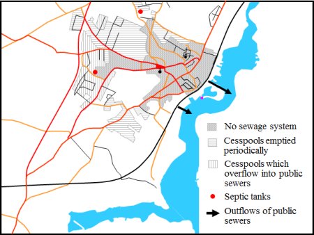 The map on the right shows the extent of each of these areas, the locations of septic tanks and the outflows of the public sewers.