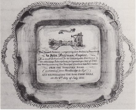 Those at the meeting praised the “exertions and perseverance” of Mr Freeman in ensuring that the debts of the turnpike trust were paid off and thereby enabling the tolls to be removed from the road from Eye to Woodbridge. To reward Mr Freeman the meeting decided to raise money to present him an “elegant dessert service of five silver dishes”. Each of the dishes carried an engraving of one of the toll gates. A photograph of one of these dishes is shown here. |