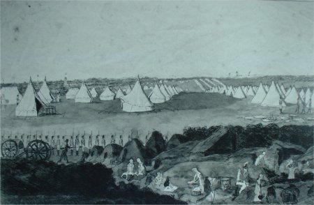 A painting of the barracks is shown on the right. In the lower right hand corner there is a depiction of “camp followers” - women, and their children, who followed their men around the country. The camp followers lived in dwellings constructed from turfs and earned money by doing the troops’ washing and by nursing sick soldiers. It was a pitiable life and such scenes were common in fields around many other barracks. |