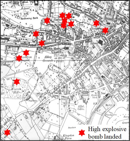 On 12th August 1915, just before the Yeomanry left Woodbridge, a German Navy Zeppelin dropped 28 high explosive and incendiary bombs on Woodbridge. This map shows where the high explosive bombs landed. The first fell on St John's Hill at10.30 pm and the last on the Ipswich Road a few minutes later. During the raid six lives were lost, 23 people were injured and over a hundred houses were destroyed or damaged.