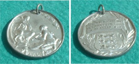 Both sides of the Peace Medal presented to all the children who attended the breakfast during the celebration of the peace. The Peace Medal bears the inscription "To commemorate the victorious conclusion of the Great War".