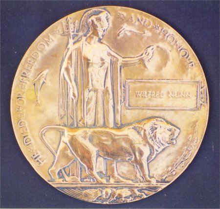 Photograph of the Memorial Plaque sent to the parents of Wilfred Nunn. Being tall, he successfully lied about his age, and had been enlisted when he was only 15. He died in action 2 years later.