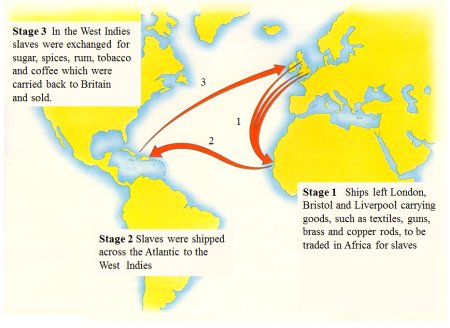 The Portuguese and Spanish dominated the early years of the trade and, by the mid seventeenth century, the Dutch and the French were the most active. By the mid eighteenth century Britain was dominant because of its naval power and because it had settled most of North America and had taken possession of many islands in the Caribbean. British slave ships also served the French, Spanish, Dutch, and Portuguese colonies. These ships sailed a triangle shown on the map on the right. They carried trading goods from Liverpool, Bristol or London to Africa. They then carried slaves to the Caribbean or North America, and then sugar, coffee, cotton, rice, and rum back to Europe.