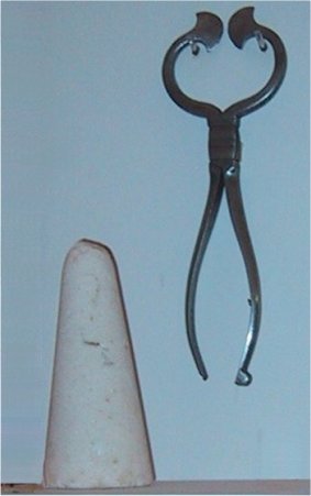 A cone of sugar and a cutter used to break it up. Such cones first reached England from Brazil in the sixteenth century.