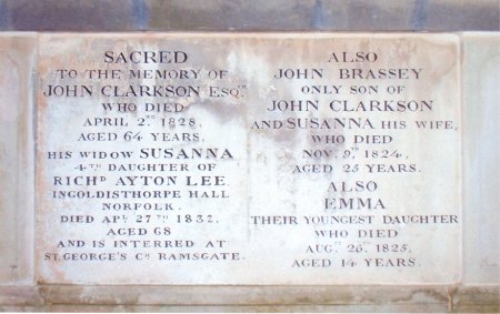 John was having an abolitionist article read to him when he died of heart disease on 2nd April 1828. His last words were, ‘It is dreadful to think, after my brother and his friends have been labouring for forty years, that such things should still be’. John Clarkson may be forgotten in Britain but copies of the prayer he delivered on his last Sunday in the struggling colony still hang in homes and public places throughout modern Sierra Leone. John was buried in St Mary's churchyard along side his son John Bassey and his daughter Emma. Only four of John’s ten children survived him Anna, Mary, Louise and Sophia. Their mother Susanna remained in the flat above the bank for some time before moving to Ramsgate where Anna lived with her husband John Rose, formerly a doctor in Woodbridge. Susanna died in 1832 and was buried in Ramsgate and an inscription was added to her husband's tomb in Woodbridge.