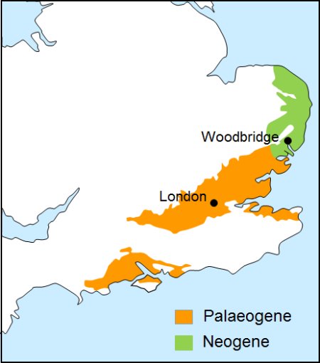 In Britain geological layers which were formed during the Palaeogene period started 65 millions ago and ended 23 millions ago. They are only found in the areas shaded orange on this map.
