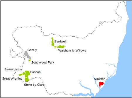 East Suffolk Central Suffolk West Suffolk Alderton (1311) Stowlangtoft (1371) Posingford (1360) Bredfield (1307) Felsham (1333) Dalham (1240) Easton (1365) Kettlebaston (1283) Thurlow (1360) Great Bealings (1310) Grundisburgh (1310)
