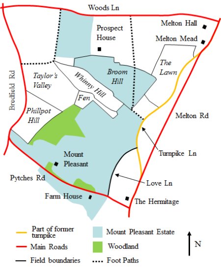 Map of the Mount Pleasant Estate and the surrounding area. It is based on the tithe map which was produced in 1837.