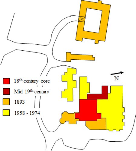The Army occupied Melton Grange during the Second World War. In 1947 it was bought by a Major Brown who made it into a Country Club which, two years later, became a hotel. The building was expanded in 1958 to provide a dinning room and in 1960 the kitchen was extended. Further extensions occurred in 1974 and some of the estate was sold to housing developers. These alterations to the mansion, along with those which occurred earlier, are all summarised by the plan shown on the right.