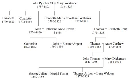 The ancestry of the Thomas Pytches who moved to Melton in 1831 can be traced back to Thomas Pyches who lived in Kirtland, Cambridgeshire from 1400 to 1480. The line of descent then passes through three men who continued to live in Kirtland. The last of them, Richard Pitches, was the first to be described as a yeoman, i.e. a freeman who had acquired a sizable amount of land. After his death in 1616 the line of descent continued through his son, John, who moved to Barnardiston, in Suffolk, and farmed land there and back in Kirtland. He died in 1636 and the line of decent continues through his son, John II. |