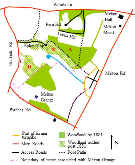 There were two area of woodland in the lower part of the Pytches estate. The largest one was to the north of the mansion and the smaller one was along Pytches Road. There was also woodland in the grounds around Melton Hall, Melton Mead and Prospect House, and lines of trees marked most of the field boundaries.