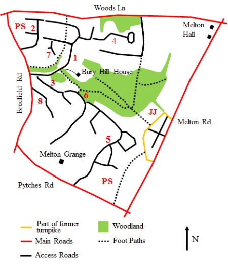 The Pytches’ estate lies within the area bounded by Pytches Road, Melton Road, Woods Lane and Bredfield Road. To the west of Woods Lane is Turnpike Lane which was created when the Melton to Woodbridge Turnpike was straightened in 1831. Turnpike Lane was linked to Pytches Road by Love Lane. For convenience the area bounded by the four main roads will be referred to as the Bury Hill area.
