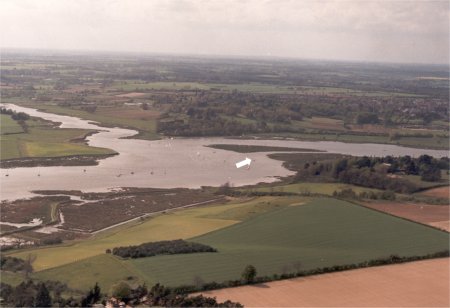John Loder II became embroiled in a libel action in 1879 and had to pay £100 damages. He was such a respected and trusted townsman that the inhabitants of Woodbridge set up a fund to pay the damages but he felt that he could not accept the £250 eventually raised. Instead he used it to improve the town by having a channel dug to cut off the troublesome corner of the river by Kyson Point. An aerial photograph of this part of the river is shown on the right and the cut is marked by the white arrow. "Loder's Cut" runs through an extensive area of saltings which are covered at high tide and it has been a blessing to yachtsmen ever since.