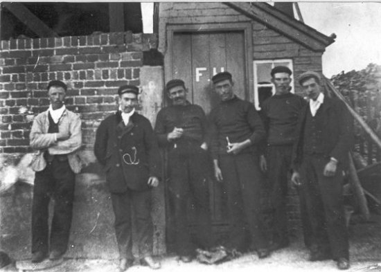 The cluster of five men in the centre of this photograph were unloading coal. The two men on the left had pristine white collars and one of them had white shoes. There job was to record how much coal was unloaded. |