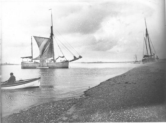 This spritsail barge is loading shingle as ballast near the entrance to the Deben estuary. |
