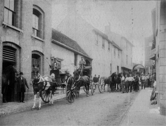 John Grout became a horse dealer of world renown. By about 1880 he had purchased two houses and an extensive garden opposite the rear yard of the hotel. He had the site cleared and then used it for a large complex of stables, called the Bull Ride. It was capable of housing up to 170 horses and representatives of both the Kaiser and the Viceroy of India came there to buy horses for the imperial and vice-regal stables. After John Grout died in November 1886 his horse dealing business, and the Bull Hotel, were taken over by William Miles. Ten years later the King of Italy granted William Miles the right to display the Royal Coat of Arms and for many years it proudly adorned the front of the Bull Hotel. After Miles died in 1899 the horse dealing business faded away. |