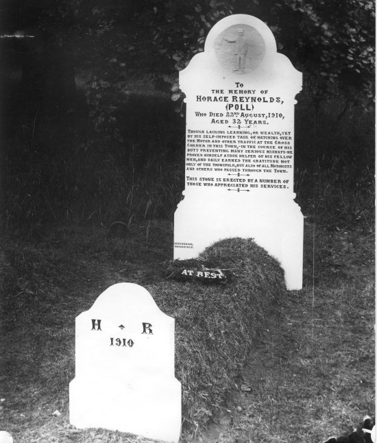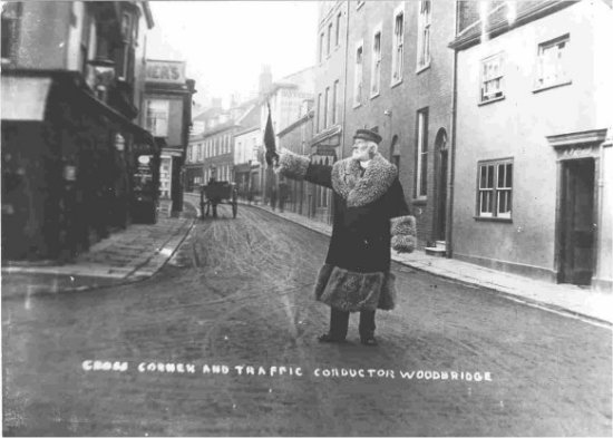 By 1900 the car and horse drawn traffic at Cross corner made it a congestion black spot. The problem was so acute that the barge hand, Horace Reynolds, or “Poll” as he was more familiarly known, took it upon himself to become the first Woodbridge Traffic Director. Starting his self-appointed task of sorting out the traffic in December 1907, “Poll” relied on tips from grateful road users to supply his daily needs. Lord Rendlesham, seeing the advantages of the service, had the Traffic Director supplied with a red coat. Poll was very popular and when he died in 1910, aged 32, and a large number of townspeople attended his funeral. |